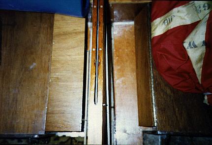 Looking straight down at the centerboard trunk, with the berth cabinets on either side. The right side extension panel is folded closed and hanging down out of the way of the footwell. The left side panel is extended for use. | |