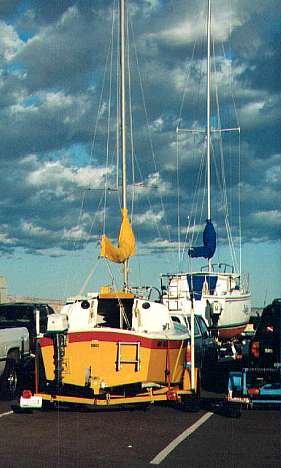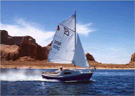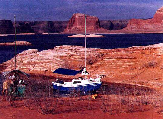 Notes on Cruising Lake PowellRalph Aeschliman Lake Powell is a fantastic, beautiful area with some two thousand miles of shoreline. The scenery is totally awesome. It is not a particularly good lake for sailing as the winds are unpredictable, varying from absolutely nothing to incredibly intense. I have spent a whole day hunkered down in a little cove rather than venture forth into gusts of 50 mph! Good sailing breezes are not real common, though they do happen, and of course in the narrow canyons the winds can swirl around a lot. If you are sailing Lake Powell be prepared to motor a lot, and when you settle in for the night it is good to secure your boat as if a gale will come up from the 'wrong' direction (even in narrow slot canyons!) because it very well might. There are incredibly calm, beautiful nights, too; I don't mean to frighten folks, but secure your boat well at night anyway. The wind almost always does a 180 degree shift as the sun goes down, so if your anchor is one of those fishing anchors, with the sliding shank, watch out that it doesn't slide. I used black electricians tape to tape mine so that it wouldn't. Anchoring can be tricky since much of the bottom is too deep, or is on a shelf next to a deep abyss. I use a portable fishfinder which gives an idea about what the bottom is like as well as its depth. The bottom is often sandstone so you need to search out a submerged dune and anchor in sand, plan to have your anchor drag a little if the wind should rise. You can also find dunes that form beaches to beach your boat. With the P-15 this was more practical than for the P-19 which sloshes water into the cabin from the daggerboard trunk when the daggerboard is raised and a wake comes along or the wind whips up waves. It can be possible to find tiny highly sheltered embayments with little beaches that make great camping situations. These are good for 19's as well, in fact I've used the daggerboard as a "stick-in-the -mud" anchor to augment the tie down/anchoring arrangement. A boom tent for shade is practically a necessity. There are some places you can go in a 15 that just inaccessible to any other cruising vessel. By backing into narrow canyons (the Evinrude, being a twin, can idle VERY slowly) I could keep an eye on the bottom and get in to areas with mere inches of clearance on each side of the boat, sometimes finding a surprise beach or hike waiting. It is true that a kayak or even a (cough, cough) PWC could get in there, to do so with your cruising rig all set up is darned amazing. I can't do this with the 19. The lake level fluctuates a lot, meaning that every time you go there it is a very different place. Places which provided good camping previously may now be fifty feet deep, or may be inland. There are new shoals and islands. Some major short cuts become available or unavailable. I usually feed the fish around my boat and they become quite tame, there are many carp, bluegill, etc. and they will come take food from your hand. I haven't got the heart to fish for them, it would be like eating your pets, and most of them don't have enough meat to justify killing them. There are lizards ashore and coyotes and other critters. There are also prehistoric indian ruins and rock art in places, if you do explore Lake Powell a few guide books should be aboard. The spring and fall are the best times, in my opinion, to explore Lake Powell. Early spring, though, means that the water will still be cold, and it can get cool in late fall, too. But this has the advantage of discouraging the PWCs and water skiers. The summers bring out all of those, plus it gets danged hot. The fall can be magical. I've thought about winter cruising on Lake Powell, you would have the lake all to yourself! But it does get cold there in winter, and the water is cold, too. Ralph Aeschliman |