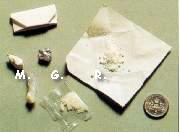 Clorhidrato de coca�na. Aunque normalmente se vende en gramos, el envoltorio de papel contiene 0,5 grms, que tendr�an un precio en la calle de entre 6.000 y 10.000 pesetas, dependiendo de su calidad y disponibilidad en el mercado ilegal. Los otros envoltorios contienen rocas de crack, cada paquete costar�a entre 5.000 y 6.000 pesetas.