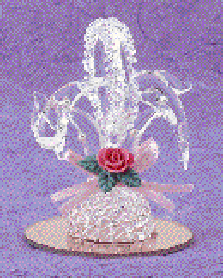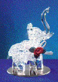 A trumpeting elephant of delicate spun glass, decorated with a ribbon and rose on a pink base.