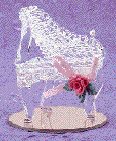 A graceful, arched stand suspends a spun glass heart over a pink wreath and sparkling glass base.