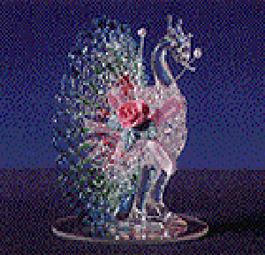 Showing off some brilliant plumage is this tri-colored peacock of spun glass. A pink ribbon and blossom dress this beautiful bird for the show.
