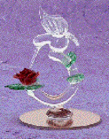 A bright rose offers sweet nectar to this spun glass hummingbird.