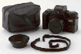 "Akira" 35mm camera features 50mm lens, easy film load system, auto advance, auto rewind, auto exposure control, and includes carrying case, additional lens hood, and shoulder strap. Requires 2 AA batteries, not included.