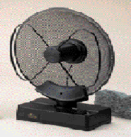 Mini 'Satellite Dish' indoor TV antenna. 360-degree rotation, UHF/VHF/FM signal enhancement, can connect to outside antenna.