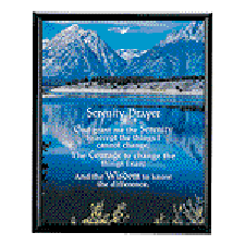 The reassuring words of the Serenity Prayer are featured on a mountain lake backdrop on this wooden wall plaque.