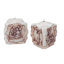 These three-sided candles reveal moments from the life of Jesus displayed on each side, including a nativity scene and the Ascension.