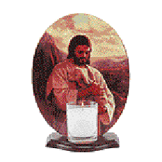 A softly tinted rendition of the Good Shepherd is presented on this unique, oval plate with wooden display stand, votive candle and clear glass holder. (For display purposes only. Do not use with food.)