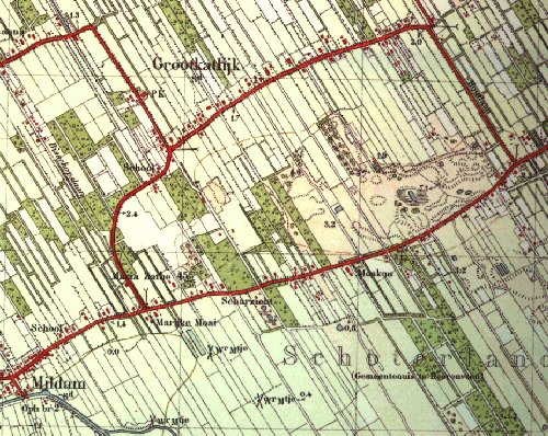 Wietze Anne Nijenhuis riep op 10 juli 1914 ‘s avonds 7.00 een vergadering bijeen in het bijgebouw van de gereformeerde kerk in Mildam om te komen tot het oprichten van een christelijke school voor kinderen uit Katlijk en Mildam. Vooraf gaande aan deze vergadering was er al het een en ander gebeurt, er was zelfs al eens eerder een vereniging opgericht voor de dorpen Oudeschoot, Mildam en Katlijk, maar door veel problemen hadden velen alweer bedankt voor deze vereniging. Op deze vergadering dus werd een nieuwe schoolvereniging opgericht en men ging al spoedig op zoek naar een bouwterrein. Dit bouwterrein moest ergens in de midden van de twee dorpen liggen, en dat werd gevonden aan de Bisschoplaan. Het was eigendom van G. Bosma, dit terrein was 122 are groot en koste f 488,--. Het werd beschreven door notaris Terlet en de betaling moest hebben plaatsgevonden op 1 mei 1915. Op de ledenvergadering word besloten een school en een onderwijzerswoning te bouwen. Er vind een aanbesteding plaats en op de bestuursvergadering van 24 oktober 1914 worden de briefjes geopend. Dan blijkt dat W. Dam uit Katlijk de laagste is met f 6.888,--, dat is f 2.007,-- goedkoper dan de hoogste. En indien mogelijk zal het schilderwerk aan Thae Woudstra worden uitbesteed. Verder word er afgesproken, dat de leden die 4 paarden hebben de materialen kosteloos naar het terrein zullen brengen en dat de andere leden het grondwerk zullen verrichten. De totale kosten worden begroot op +/- f 9.000,--, maar hoe kwam men aan dit geld? Dit kwam grotendeels uit schenkingen van leden en niet leden, en opvallend is dat hier ook mensen bij zijn uit Oude en Nieuwehorne. Het resterende geld werd geleend bij de Groningse Hypotheekbank en bij W.A.Nijenhuis. Ook werd er een Suppletiefonds opgericht onder naam "draagt elkanders lasten en vervul alzo de Wet van Christus". De bedoeling hiervan kunnen we lezen in art. 2 van haar regelement, dit luid. Haar doel is om door vaste wekelijksche bijdragen, of op andere wijze, naar oordeel van het bestuur, gelden te verzamelen en deze gelden te doen strekken, om het schoolgeld van die kinderen aan te vullen, wier ouders het volle schoolgeld niet kunnen betalen. Op 1 april 1915 werd de school geopend, er waren toen 2 leerkrachten te weten D. Runia -hoofd van de school- en een onderwijzer Brombacher. Ook was er een handwerkonderwijzeres Mej. A. Jongsma en een schoonmaakster Mevr. A. Brandsma. De school telde bij de opening 70 kinderen wat voor een plattelands school een flink aantal was. Uiteraard ging dit ten koste van het aantal leerlingen op de openbare school in Mildam, het aantal zakte daar van 124 naar 71 leerlingen in januari 1916. Bij de feestelijke opening werden uiteraard ook kosten gemaakt, hiervoor werd wel gecollecteerd, maar er was toch een nadelig saldo van f 15,75. De voorzitter wil niet dat dit tekort wordt geboekt. Hij wil de helft wel betalen, als de overige bestuursleden dan de rest met elkaar willen aanvullen. De school die in 1914 werd gesticht bestaat nog steeds, overigens is er wel een nieuwe school gekomen en ook het schoolhuis is inmiddels vervangen door een nieuwe. Verder is er veel te lezen over deze school in het boek "75 jaar christelijk onderwijs in Katlijk" door Feitze Krekt.