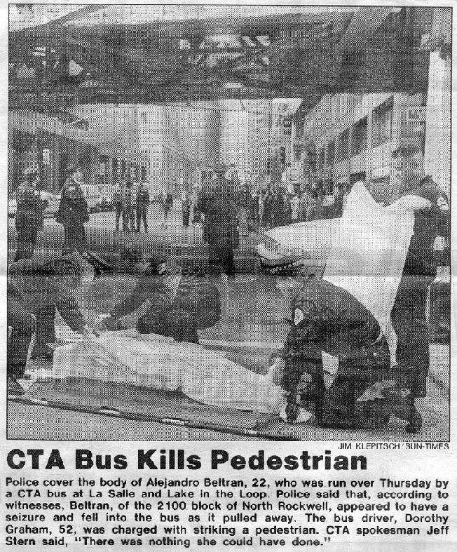 This guy was standing by the el-tracks on the corner, when he had a seizure and fell under the bus tires as the bus was pulling away. We first thought that the bus was trying to make a turn an crushed the dude between the track supports and the side of the bus. This was because there was blood all over the back of the bus, and blood on the supports. We found out that the blood was thrown everywhere once the tires were on top of him and started to spin.