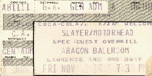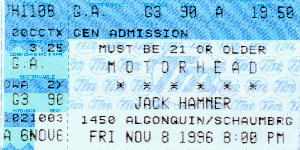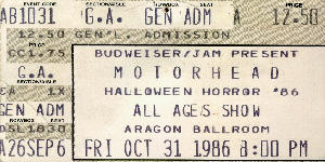 My first Mot�rhead show. I don't even remember the bands that opened for them, maybe Overkill & the Cro-Mags. It was to promote the album Orgasmatron. I went to a record signing at Music Warehouse in Downers Grove and meet Lemmy before the show. I have a picture that I took of him at the signing but I was to scared to ask if I could be in it with him. By this time I had my Camaro with the word Mot�rhead plastered, in red, on the bumper, and Z-rock was blazing on the radio.