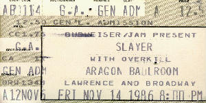 " Me being a total gentleman gave my seat to her. I knew that after the lights went down I could sneak back up front and my friends would let me squeeze in with the chick. As me and the bouncer started walking back toward my seat, I saw that the chick bolted, so I sat with my friends and headbanged so hard that I lost a couple of brain cells. After the show I saw the chick again and through a drunkin conversation she told me that she had left because she didn't want to get me in trouble. Slayer was great as always, and Kerry King looked like a leather covered gorilla.