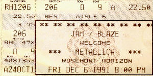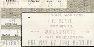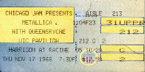 Another one of those "sold out" shows. I went into ticket master about 5:30 and asked for tickets. The lady said that there wasn't any. I asked, "Are you really sure?" She said that the three headbangers that just left had her check, and there were none. I said, "Please check again, for me." As soon as she found it she goes, "Hey now there are plenty of tickets." I'll take two and away I went. When I got into the show I asked the people around me where they got their seats, and they had won them from a station. The show was the best I had seen in a long time. Suicidal Tendencies opened and jammed, then Queensryche rocked, and finally Metallica ruled.