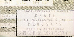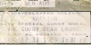 This was quite a show, as you can tell by the trashed ticket stub. The best thing that happened was that we grabbed a seat at the bar and went up to the stage in turns (there were three of us.) When one would take a break from the pit the other would go up and the wasted one would hold the seat. The reason the seat was so important was that we could reach the beer tap from it. We ordered one beer and three drunk and broke headbangers were kept in beer all night. MORE MONEY FOR T-SHIRTS! Never saw a bad show at the Cubby Bear. As for Gorguts, I don't remember a thing about them.