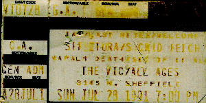 This turned out to be the concert event of the year. All my metal head friends were talking about this one years after it was over. The joint was sold out, they even had the balcony open. There was a mosh pit behind the last row of chairs, as the concert went on the rows of chairs keep disappearing into the pit. We all had to climb up on the next row, just to get wiped out again. I think this is one of the reasons that the Brawl Room doesn't bother with chairs any more. On a side note, I was in the pit with my leather on. I was smashing into dudes when I shouldered this kid in the stomach, as I pulled back he grabbed his chest and screamed, like it really hurt! I didn't understand what the problem was and then I looked at my shoulder and I forgot that the jacket had handgernades hanging off the epaulets. I apologized and removed my coat for the rest of the night.
