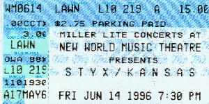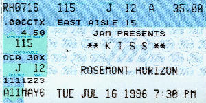 This was the one to see! They all had their makeup on, and were acting really chummy together. I guess tons-o-money can bring anyone back together. America was so taken with them getting togeather again that Playboy even did a picture spread on them. They did only the stuff off their makeup albums, Destroyer, Love Gun, Rock 'N' Roll, Dressed to Kill, and Kiss. No "I was made for lovin you", "Heaven's on fire", or "Lick it Up". Only the good stuff. I got to see Ace's guitar fly away, Peter doing "Beth", and Gene spitting fire and blood. It was a good concert. The opening band was a one-hit wonder that has sense disappeared.