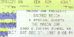 This one kind of took me by surprise. I want to Phoenix to visit my family for Christmas. I have a real cool friend out there and he wanted me to go to this show. I said, "OK" and off we went. A bunch of crap local bands opened. I was never a big fan of Sacred Reich, but they did a jammin version of War Pigs. The coolest thing about this show was the bar it was in, The Brown Jug. They had it divided into two parts with a chain link fence. On side had the bar and the stage, the other side was for the under 21 crowd. At one time our 'waitress' started walking around in her underwear and asking guys to touch her butt. The management soon put a stop to it. I also read a great story about Wendy O. Williams playing there. I felt the history of the place as soon I came in the door. It was way loud and my ears were ringing for two days after the show.
