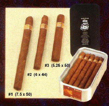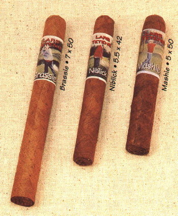 Click here if you want to read his story in his own words. They are the most unique cigars I have ever smoked. Some of them taste and smell like your sucking on a stick of perfume, others are just a real strong taste. I tried my first one (Niblick), and didn't like it very much. I decided to give them another chance, and was hooked. I think the thing I like best about them is the "Die Toxic" logo on all their smokes. The only problem is that they are one the most expensive cigar brands you can buy, and a lot of cigar stores won't carry them because they are worried about being stuck with them if they can't sell. A funny thing about Lars is that people either really like them or can't stand them. I've asked for them in several shopes and hear, "I won't carry that crap, it will ruin the rest of my selection!", or "I can't keep them in stock, check back soon."