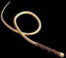 A whip or flogger is as personal as the person who uses it. There are a wide variety of whips, floggers and other implements to choose from, each one having a unique feel in the hand and on the skin. The following are some features to consider when purchasing a whip: Balance and Weight An important feature of any whip is that it is well-balanced and comfortable in the hand, especially if it is to be used for long periods of time. A perfectly balanced whip should poise evenly on a fingertip with the fulcrum at the lash end of the handle. This reduces strain on the wrist, arm and shoulder as the natural pivot of the whip will be at that point. Minimal effort is required to keep the whip in a smooth and steady 'figure 8' stroke when the whip is well balanced. Some people prefer a whip that is handle-heavy, but this throws the piece out of balance and makes additional demands on the strength of the user. The diameter of the handle is also very important, and choice depends on the size of the hand wielding the piece. A slender handle will provide a stable and comfortable grip for a smaller hand, while a thick handle can cause cramping and muscle strain for the same hand. A whip handle should feel comfortable and secure in a light but firm grip. A good 'rule of thumb' for sizing is to hold the handle securely, wrapping your thumb around over the fingers (although this is not recommended as a grip). The thumb should reach the first knuckle of the middle finger on a properly sized handle. When you are holding the piece for use, the thumb should lie at a comfortable angle (approximately 45 degrees) to the vertical axis of the handle. Your own personal preference may be for a different diameter handle - always choose what feels best to you. Lashes The lashes or 'falls' are the working end of the whip, and vary widely. Everything from string and rope to chain and wire have been used for lashes. For our purposes, we will deal primarily with the effects of leather lashes. Flat lashes Flat lashes are even strips of leather of various widths, lengths and dressed ends. Generally a wider lash will give more of a "thud" and a narrower lash will have more sting. The length chosen depends not only on the preference of the user and the space available for use, but the control and effect desired. Longer lashes require not only more space for use, but a higher degree of control to maintain an even strike. The ends of longer lashes will be moving faster upon impact, and thus create a more intense sensation. Longer lashes are also good for "wrapping" - letting the lash ends wrap around the body at the culmination of the stroke. Cutting the ends (or "dressing them) can also alter the effect of the stroke. Angled, pointed and "forked" ends result in more of a stinging sensation at the lash end. Rounded or square cut ends provide a softer finish. Flat Braided Lashes These lashes are a wider lash, braided in the traditional three-strand style. Sensations' pieces are either braided with the ends intact (rather than cut and sealed) or completed with a finish knot. This creates a more secure end for longer wear. The effect of flat braiding is to create a heavier, somewhat rougher lash with a beautiful aesthetic appearance and orderly flow to the stroke. Round Braided Lashes Round braided lashes are made in four or six narrow strips of leather creating a lash with a circular circumference. The lashes are then worked and smoothed, resulting in a dense, smoothly finished lash that is very supple. Lashes braided in narrow strips of kangaroo have a hard, polished finish, are exceptionally smooth and supple. Lashes braided in heavy suede cannot be polished and often have nubby edges notable for leaving rows of fingertip-type bruises. Lashes can be braided in a wide variety of materials, for varying degrees of effect. Round braids may be finished with smooth, rounded ends or tied off in a small, hard round knot called a Turk's head. If knotted, the strand ends may be further splayed and angled for additional sensation, or trimmed and turned into the finish knot. Knots may also be braided into the lash at various intervals to create a knotted scourge. Appearance You may choose a black whip of severe lines for the harsh psychological effect, or something trimmed in animal fur, horn or hoof for something a little more barbaric. A whip may be a romantic expression or a fun piece, and chosen for the aesthetic beauty of its color and intricate workmanship. Whatever style of handle and fall you choose, the whip is ultimately an expression of the owner's personal style. A Little About Leathers The effect a whip produces depends a great deal on the type of leather used in the falls. Leather is a natural product that varies by animal and by the weight of the hide. Heavier leather is thicker, denser hide. The characteristics of the leather vary widely depending on the original animal and the type of tanning and processing. The following are some of the typical characteristics of various kinds of leather and suede: Deerskin -- A soft, supple, elastic skin that is also highly durable. Deerskin also has the widest sensation "range" of most leather, the effect depending largely on the intensity and style of the stroke. Latigo -- Latigo is a heavy, all weather leather often used for tack and other equestrian needs. It is heavy cow hide that is oil-tanned to make it weather resistant. Lashes are harder and stiffer than most other kinds of leather resulting in a high level of sensation. Latigo is often used for collars, cuffs, paddles and straps, as well as whips. Cow -- Cow hide varies the most widely in weight and processing. It is strong and durable either as a leather or a suede, and when processed as "nubuck" or for gloving, can closely resembles deer. Calf -- A finer grain than cowhide, this leather is distinguished by an exceptional suppleness that comes from young hides Cabretta -- Cabretta is made from the skin of a sheep (sometimes a