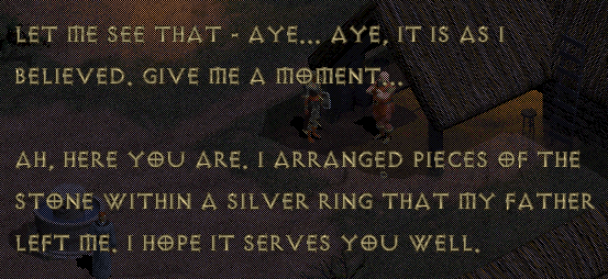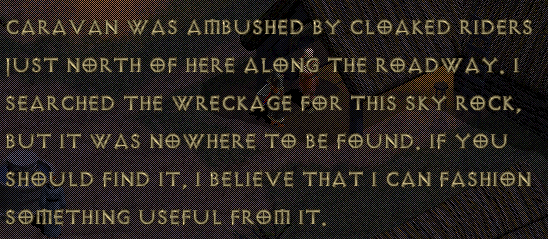 You'll get this quest when you reach level 5 and talk to Griswold. He will tell you a tale about a caravan that was carying a piece from the heavens. Then some cloaked dudes and ambushed the caravan. When Griswold searched for the rock, he didn't found it. Now it's your job to find it. This is easy, you should find the rock in level 5 or 6 laying on a table, grab it and take it to Griswold. He will make an excelent ring from it, The Empyrean Band. Use it, its very good.