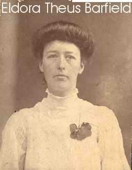 Thomas Lafayette Barfield on 12-Dec-1904 by J.T. Joung, M.G., died 8-Aug-1960. Buried Bethlehem. They had five children. [ Photo Eldora Theus Barfield ] [ Photo TL Barfield c.1905 ] [ Photo Tom&Dora Barfield Oct.1958 ]Mrs. T. B. Theus and daughter, Mrs. T. L. Barfield visited her brother, Mr. Gresham of Howard. Mrs. T. B. Theus was Susan Emma Gresham daughter of George W. Gresham and his first wife, Sarah Jane McKenney. Mr. Gresham of Howard was Jefferson D. Gresham son of George W. Gresham and his second wife Sarah Frances Snelson. Sarah Frances Snelson was daughter of John Snelson and Polly Reeves. John Snelson married George Gresham's mother, Matilda McKenney Gresham widow of Pleasant Gresham. Matilda McKenney Gresham and Sarah Jane McKenney were 1st cousins once removed and Matilda was her mother-in-law.THE BUTLER HERALD, Taylor Co., Ga. January 19, 1909