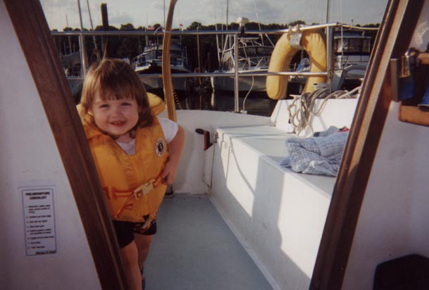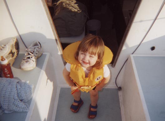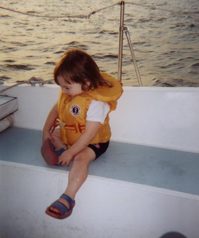 | She was showing off for the camera. I thought she would be a bit uneasy with the boat movement. She did very well and would have have gotten sea sick at all except we had to have one of those "Daddy to Daddy's Gril" talks. So I took her below in the hold for a bit. It was the worst thing I could have done. With all the tossing & turning she got sick. Didn't stop her though, she still wanted to run the boat!! | |||||||||||||||||||