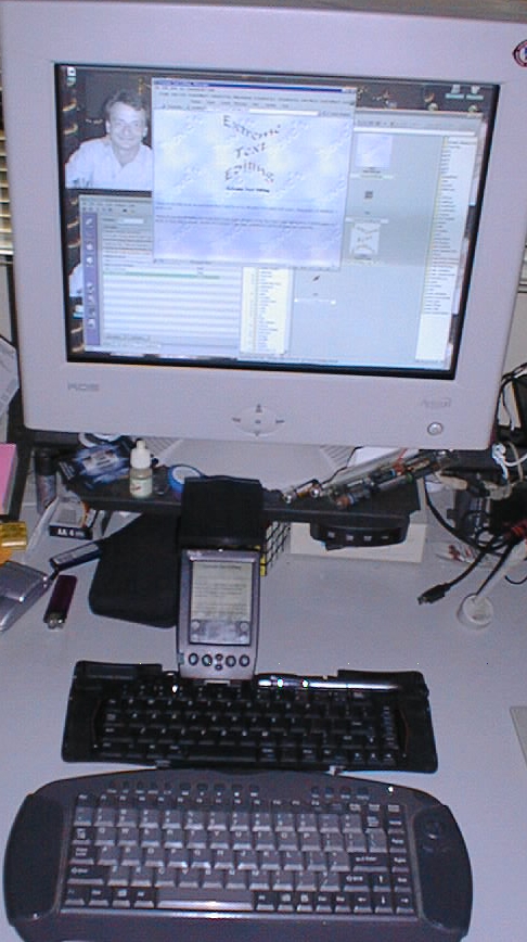 The focal point of this document at present is editing and composing text, though, and as such we'll turn our attention to some keyboard solutions. There are other alternatives to textual input for your PDA though, but I'll just be documenting what I know and use. The photos below are images of my home PC and Palm IIIc PDA.