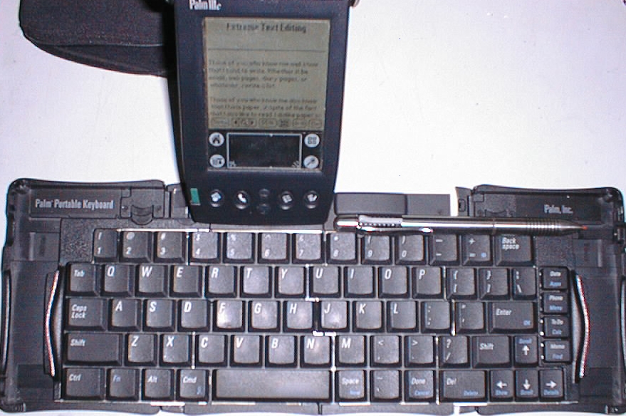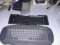 After a minor mastery of image manipulation, I decided to expose myself to a little bit of animation, as well as video manipulation via a video capture/playback card I purchased. As to get the full effect of the efforts of my work, I have to sit back to view the results on a fairly large screen television as opposed to the tiny 19" monitor, the corded keyboard I was using wasn't cutting it. Thus, I picked up an infrared keyboard, and initially griped because it's keyboard layout was very different than the 101-key keyboards I have grown used to over the last 15 years or so. When I later acquired a Palm Portable Keyboard for my PDA, I initially complained about it's keyboard layout too, until I noted the similarity between it and the keyboard that's on my home PC. Interestingly enough, although I have no need for a laptop at present, this keyboard arrangement seems to be very prevalent on laptops! As the Palm Portable Keyboard folds to a size a little larger than the PDA itself, it's convenient traveling companion. Also, solutions exist that allow you to use your PC's keyboard to type directly in your PDA, and some of these solutions will be explored here.