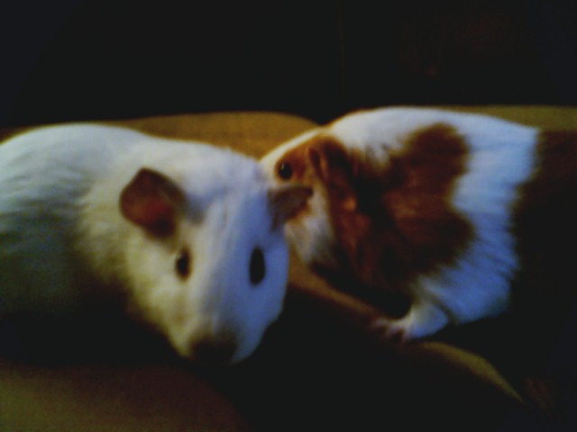 Snowball is a 3 month old guinea pig.We got her about a month ago and she is very well tempered. She is very cute and is best buddies with my dad. She hardly ever bites but has VERY sharp claws and likes to climb. The first time we clipped her nails she sqermed all over. Click here to see how we cut them. When she first met Patchy our other guinea pig she thought she was her mother or somthing because she kept following her every where she went when we let them free in our dinning room. She loves to listen to the radio.
