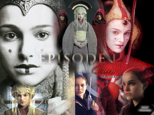 6 pictures of Queen Amidala (Natalie Portman) from Starwars Episode One compiled together with added text, designed as a Desktop background. Designed and Created by Jeff Fernandez.