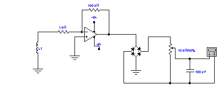 The diagram below shows the schematic for this circuit. The coil, L1 is directly coupled to the input of the amplifier. The amplifier has a gain of 100 and will provide enough amplitude to drive the bridge diodes and still have nice amplitude remaining to drive an indicating device. By using two batteries we can get twice the peak amplitude on the output. The bridge diodes are 1N4149 switching diodes, but with this amplitude almost any diodes will work. The indicator is any device you would like to use. I am using an old meter movement from some military surplus equipment I had around my shop. As you can see the circuit is simple in operation. As stated above I started out with a much more elaborate amplifier system, but found that this little op-amp is all that is needed, keep it simple and inexpensive is always the best approach. The system has been removed from my breadboard and will be tested on real models soon. I will post an update at that time.
