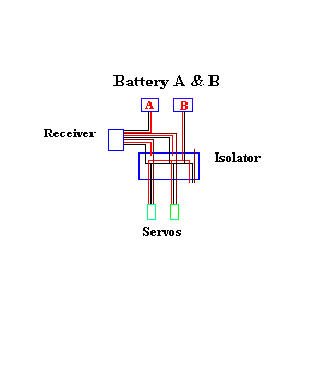 Here is a diagram of a simple isolator. You can see that the positive lead coming from battery A is not used by the servos. The servos pick up their power from battery B on the voltage bus in the isolator.