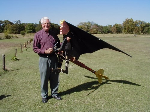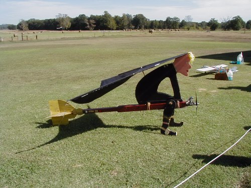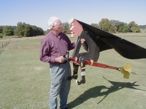 You know its getting close to Halloween when the witches start flying on their brooms. This flying witch was built by Gene Morris and is powered by a Saito 91. Even though it is quite large in size it has a weight of only 5 pounds. It is made of all balsa and foam with a few brass rods in her cape. The witch is flown with elevator and rudder, Gene has the rudder on the aileron control stick. It is fun to watch her fly around the sky with her cape flopping in the wind, talk about flutter! Gene controls it as much with the throttle as he does the rudder and elevator. When he gives it more throttle it goes up as if you had given it up elevator. If you haven't seen Gene's witch fly on her broom you have got to see it. Maybe we can talk Gene into flying it at the charity fair on October 27.