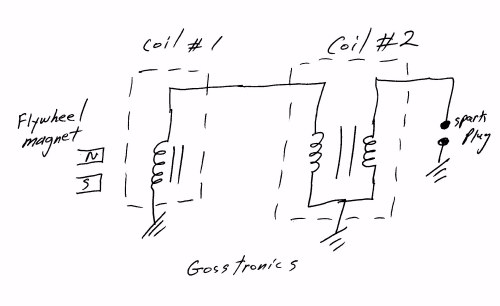 You may also wonder why an ignition needs a switch in the first place, be it points or transistor. Without a switch to control the firing system the high voltage pulse would be erratic in its time duration. Remember that getting the plug to fire when the piston is in the correct position around top dead center is what it is all about. If the high voltage pulse reaches its peak a few milliseconds before or after it should, the engine is going to be out of time and strange things will happen. So a switch will only allow the high voltage pulse to exist while in time with the piston's power stroke. More on this down below. Here is a diagram that shows the relationship between the two coils. Electronics part of the system is omitted.