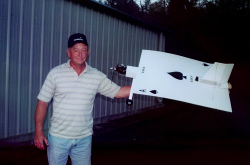 Last month it was the disk plane, this month it is the “Ace Of Spades” built from coroplast. This one will fly just as well as the disk if not better. It has similar characteristics to the disk plane, but with more wing area, 864 sq inches, it descends with more grace. Hovers well and has a good flat spin and fast rolls. Weight is around 5 ½ lbs. with an Ervine .53 engine. It has the same airfoil on its wing as does the disk plane, almost flat.