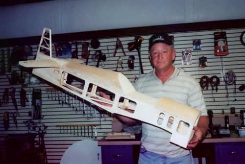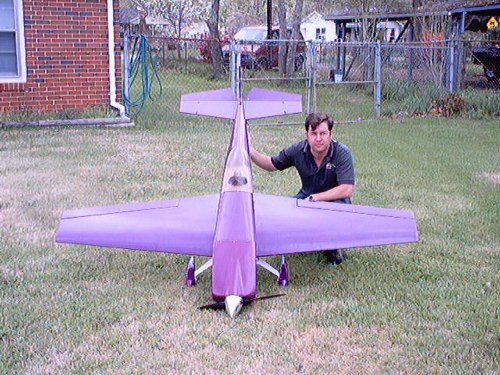 Here you can see why it only weighs three pounds and that it absolutely has no airfoil, it has a perfectly flat wing. You can have as much fun with this plane as any you have ever flown and it only cost about $10 to build, minus engine and radio.