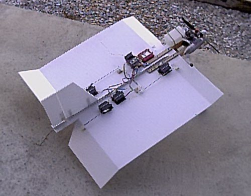 You have probably seen my Stamp with twin rudders. I was very pleased with the way it handled in the air and on the ground. It also had a unique look in the air and was no more difficult to fly than the regular Postage Stamp. On the way home from the flying field the other day I was thinking that if the Stamp flies so well with twin in-line rudders, how would it do with twin elevons? In other words have a set of elevons in the rear of the plane like they are now, and also have a set of elevons located at the front of the plane. The elevons at the rear of the Stamp are 4-inches wide, I think the front elevons would probably need to be a little smaller, about 2.5 inches and have less throw than the rear elevons. The Stamp already has the tightest loop of any plane; it is more of a tumble than a loop. Of course it will also do nice big loops like any other plane, but with front elevons there is no telling what it will do. When I got home from the field I went to work.