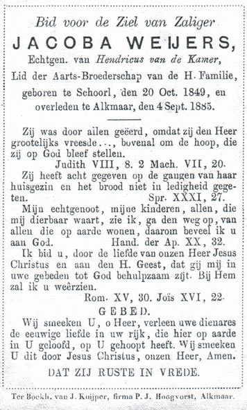Jacoba Weijers is geboren op zaterdag 20 oktober 1849 in Schoorl, dochter van Nicolaas Weijers en Catharina Leek. Jacoba is overleden op vrijdag 4 september 1885 in Alkmaar, 35 jaar oud. Jacoba trouwde, 23 jaar oud, op zondag 25 mei 1873 in Alkmaar met Hendrikus van de Kamer, 24 jaar oud. Hendrikus is geboren op zondag 10 september 1848 in Alkmaar, zoon van Joseph van de Kamer en Maria Boersen. Hendrikus is overleden op maandag 13 juni 1927 in Alkmaar, 78 jaar oud. Hij is begraven op vrijdag 17 juni 1927 in Alkmaar RK kerkhof St. Barbara. Hij trouwde voorheen met Gerarda Maria Wennekes (1854-1940).