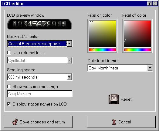 nastavení barev LCD a rychlosti rolování textu