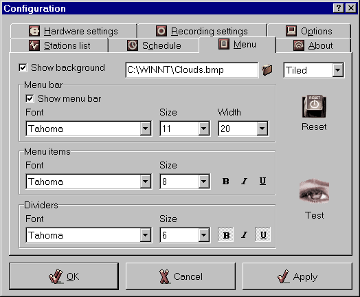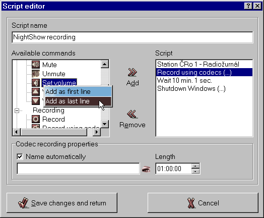 Seznam proměnných: : %y (rok), %m (měsíc), %d (den), %h (hodina), %n (minuty), %s (sekundy), %f (frekvence v MHz - např. 89_70), %b (číslo stanice), %a (jméno stanice), %l (přihlašovací jméno do Windows), %c (jméno kodeku).