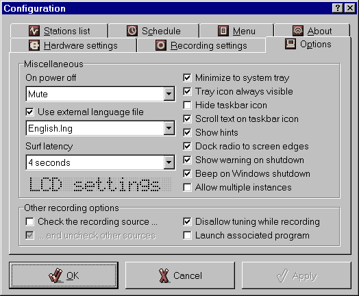 zvuku včetně použití kodeků, využití myši včetně podpory kolečka, volitelné zobrazení jako ikony v tray, snadná editace a řazení stanic, přímé ladění z klávesnice, využití parametrů příkazové řádky, podpora jazykových modulů, integrace do ATI MMC,