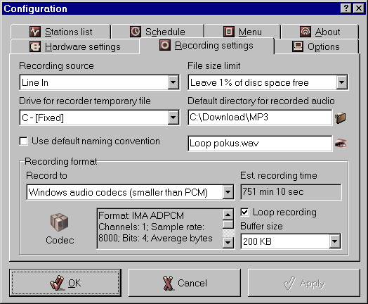 Tip pro vytváření adresářů: vložte do názvu souboru např. %a\%m%d.wav a nahrávky budou rozdělovány do adresářů podle jmen stanic.