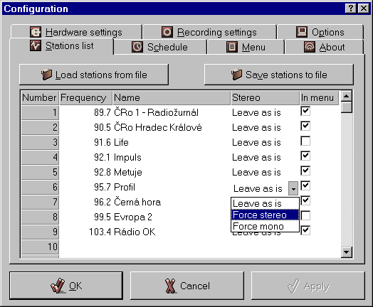 každé stanic lze nastavit preferenci sterea (ponechat jak je, vždy stereo, vždy mono)