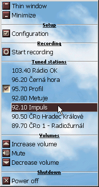 otočení kolečka nahoru... zvýšení hlasitosti Nápis Radiator: kliknutí pravým tlačítkem ... tray icon menu Čísla stanic: kliknutí pravým tlačítkem ... menu stanice Tlačítko autom. vypnutí: kliknutí levým tlačítkem ... start/stop sleep timeru LCD na úzké liště: přepnutí mezi zobrazením stanice a zobrazením data a času LCD zobrazující čas v normálním okně: při nahrávání levé kliknutí přepíná mezi způsoby zobrazení,pravé kliknutí otevře menu; LCD pro zobrazení frekvence v normálním okně: zobrazí na chvíli frekvenci pro danou stanici |