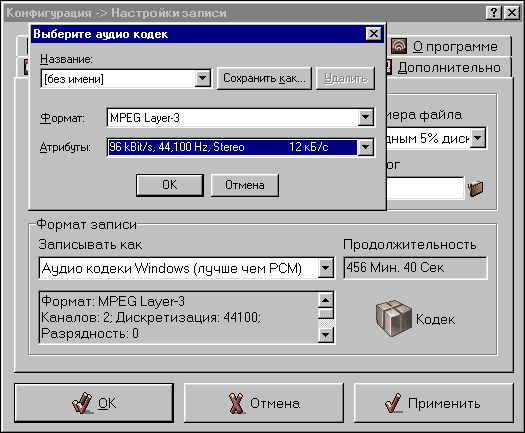 | MPEG Layer 3 | x - система виснет | x - система виснет | OK при следующих установках: почти любой высокий битрейт (56 kBit/s и выше) | вероятно ошибка где-нибудь в Win98 или непосредственно в самом кодеке |