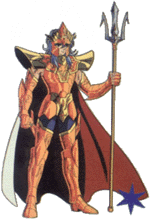En el palacio de Poseidón, Shaina (Caballero Femenino de la Cobra; antes enemiga, ahora enamorada de Seiya) ataca a Poseidón con su técnica sin mucho éxito. Poseidón le quita su máscara y la mata. Seiya, Shiryu, Hyoga y Shun están muy dañados, pero aun así se dirigen al palacio de Poseidón. En el último Pilar que queda de pie, Kanon no quiere que ataquen a Poseidón, porque la pelea podría hacer que el dios Poseidón que duerme en el cuerpo de Julián Solo, despierte de su sueño. Seiya y sus amigos llegan frente a Poseidón, pero cuando lo intentan atacar son fácilmente vencidos por el poder de Poseidón. Cuando Poseidón está por acabarlos, la armadura dorada de Sagitario aparece y se la pone Seiya. Con su poder aumentado, Seiya utiliza su Golpe de Meteoro contra Poseidón, pero todos sus golpes se regresan contra de él. Seiya saca la flecha dorada de Sagitario y la apunta contra Poseidón, pero al dispararla Poseidón la regresa y se clava en el corazón de Seiya. Poseidón piensa que ha ganado, pero la armadura dorada protegió a Seiya y se vuelve a poner de pie. Seiya vuelve a apuntar la flecha dorada y dispara. La flecha vuelve a regresar, pero Shaina se interpone entre Seiya y la flecha. Shaina le pide a Seiya que vuelva a intentarlo, ya que ella será su escudo. Seiya vuelve a lanzar la flecha y ésta vuelve a regresar pero ahora es Shiryu quien se interpone. Shiryu y Hyoga han llegado y le dicen a Seiya que ellos serán su escudo. |