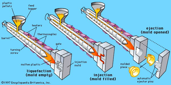 3: Injection molding of thermoplastic polymers. (Left) Plastic pellets