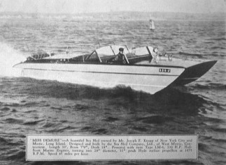 A copy from POWER BOATING November 1921 P.14 AN ATLANTIC CITY SEA SLED A NEW attraction has been added at Atlantic City which may yet popularize the "City of Many Hotels". Just as at Palm Beach last February when Orlo II, carrying up to 24 passengers, found difficulty in satiating the appetite of those desirous of a ride, the Atlantic City boat has been kept busy this summer driving parties of the fair an beautiful, and their male escorts, on the open ocean. This Sea Sled is fast. It is said she is continuously crossing and recrossing the wake of previous trips, accounting somewhat for the spectacular pictures. Curiosity, as to just what a ride in a Sea Sled is like has brought out many converts and enthusiastic champions to the side of Albert Hickman, the inventor. Manouvering in crowded quarters, departing or approaching a dock at slow engine speed, the Sea Sled has no equal. She can revolve as on a pivot. The prime requisite, a fast boat with great carrying capacity has been fulfilled. From the moment the clutch is thrown in there is a gradual acceleration, like a high powered car topping a hill, shooting over the crest, and down the other side of a road smoother than man has ever made. This is equally easy with a dozen passengers aboard. When full speed is reached, the throttles are closed to three-quarter opening and the two engines run without effort. If the sea is short and choppy, there is so bumping. Imagine a runabout with a deep V section, easing into it, and consider that a Sea Sled has two such V's , with possibly crowded air between the two. The engines in the Atlantic City boat are twin 6-cylinder Sterlings of the overhead dual valve type, total 450 horsepower which have attained 54 miles per hour in some boats. Top speed is reached at about 1800 revolutions per minute after which the engines are usually checked to about 1200 to 1400. The advanced design of the engines, weighing under 7 pounds per horsepower, the triple ignition, the oil coolers and filters, the sturdy clutch and reverse gear, all contribute a share to success. The Sea Sled from double V bow to surface propeller, is not the product of chance or "happenstance". Hickman, the inventor is also a noted author, his patent a contribution to science, and Hickman, the man, is a philosopher. The latest boats are evolutions, based upon carefully compiled technical data, and the season of 1921 has seen them brought into prominence on sheer merit. The Boat illustrated has a length of 40 feet and a beam of 7 feet 9 inches and is owned by the Atlantic City Operating Co.. At the close of the northern season she will migrate to Palm Beach and Miami |