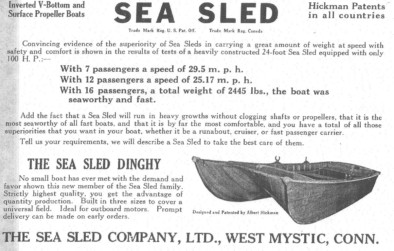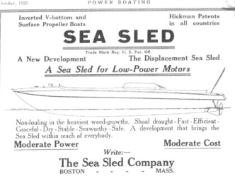 A copy from POWER BOATING June.1920 P.63 Inverted V-Bottom Surface Propeller Boats Hickman Patents in all Countries S E A S L E D Trade Mark Reg. U.S. Pat. Off. incomparably the Finest Sea Boat in the World |