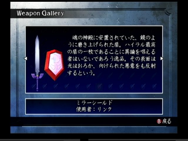 The Legend: Mirror Shield: [The Legend of Zelda: A Link to the Past] -The Mirror Shield in ALttP was found in Level 8: Turtle Rock. It deflected most attacks and was stonger than the Fighter's Shield and Red Shield. [The Legend of Zelda: Link's Awakening] -In Level 7: Eagle's Tower, Link received the Mirror Shield, or Level-2 Shield, to use to withstand the attacks of the Evil Eagle. [The Legend of Zelda: Ocarina of Time] -The Mirror Shield in OoT was found in the Spirit Temple. In order to find this treasure, Link had to go back in time to get the Silver Gaunt- lets as a child, then return as an Adult to find it. The Mirror Shield was Link's only defense, and weapon, against Ganondorf's surrogate mother(s), Twinrova. The Shield originally carried the Gerudo symbol seen on this version, but this was removed in Nintendo's re-release on Gamecube (The Legend of Zelda: Ocarina of Time Master Quest) due to what it was/resembled. It was replaced with the image found on Veran and General Onoxo from the Zelda Oracle games. [The Legend of Zelda: Majora's Mask] -Link finds the Mirror Shield hidden deep within the well of Ikana Canyon after persuading a few Gibdo into letting him by. This was used as a source of reflecting light until Link gained the Light Arrows. [The Legend of Zelda: Oracle of Ages/Oracle of Seasons] -The Mirror Shield in OoA and OoS was merely an upgraded version of Link's Iron Shield (and actually a secret only obtainable through playing both games). The Mirror Shield was given to Link through password systems. Link can get it from a Master Librarian in the Past Library in Ages(after learning a password from a Ghini in Holodrum) or from Subrosian Smithy in Seasons(after learning a password from a Subrosian in Rolling Ridge in Labrynna) or from Farore in the Maku Tree (through other passwords). The shield allows you to avoid most damage and deflect most projectiles. [The Legend of Zelda: The Wind Waker] -The Mirror Shield is found in the Earth Temple with the help of Medli. Using this, combined with the Command Melody and Medli's Harp, Link could over come any obstacle in the dark. This item was useful against Dark ChuChu, Poes and Jalhalla...but only if there is light to shine on the situation.